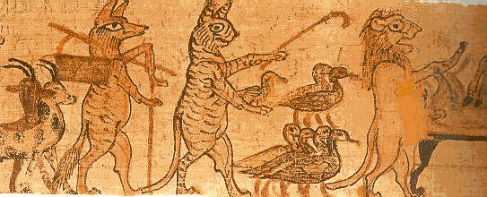 جزء من بردية، يرجع تاريخها إلى عام 1150 قبل الميلاد (يُرى في البردية: قطة، ترعى سرباً من الإوز؛ وثعلب يعنى بقطيع من الماعز)