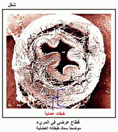 قطاع عرضي في المريء، موضحاً سمك طبقاته العضلية