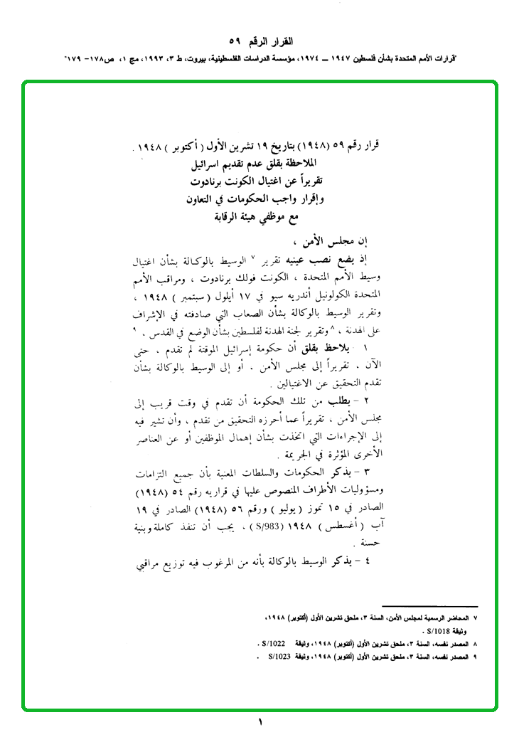 الملاحظة بقلق عدم تقديم إسرائيل تقريراً عن اغتيال الكونت برنادوت وإقرار واجب الحكومات في التعاون مع موظفي هيئة الرقابة