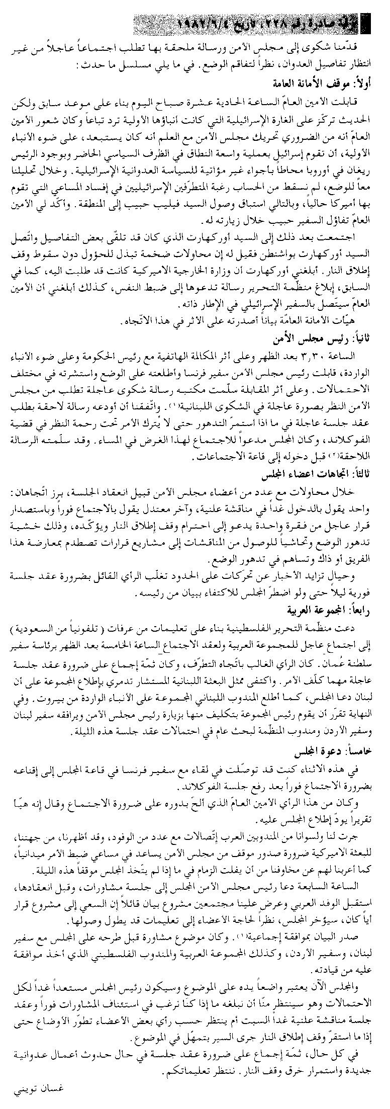 المرسلة من غسان تويني، المندوب اللبناني بالأمم المتحدة إلى وزير الخارجية اللبناني