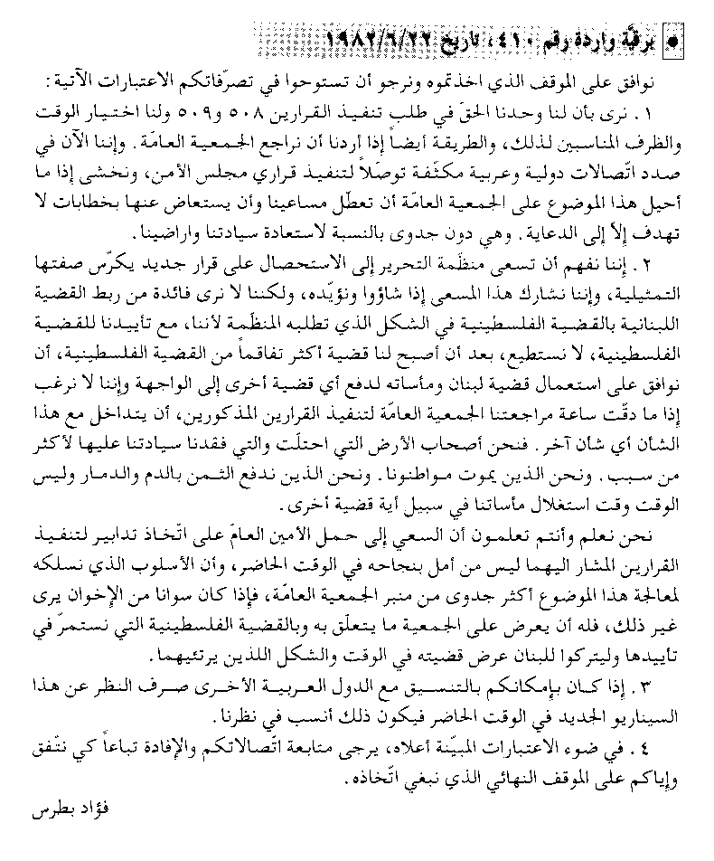 رد وزير الخارجية اللبناني، في البرقية الرقم (410)، في 22 يونيه 1982