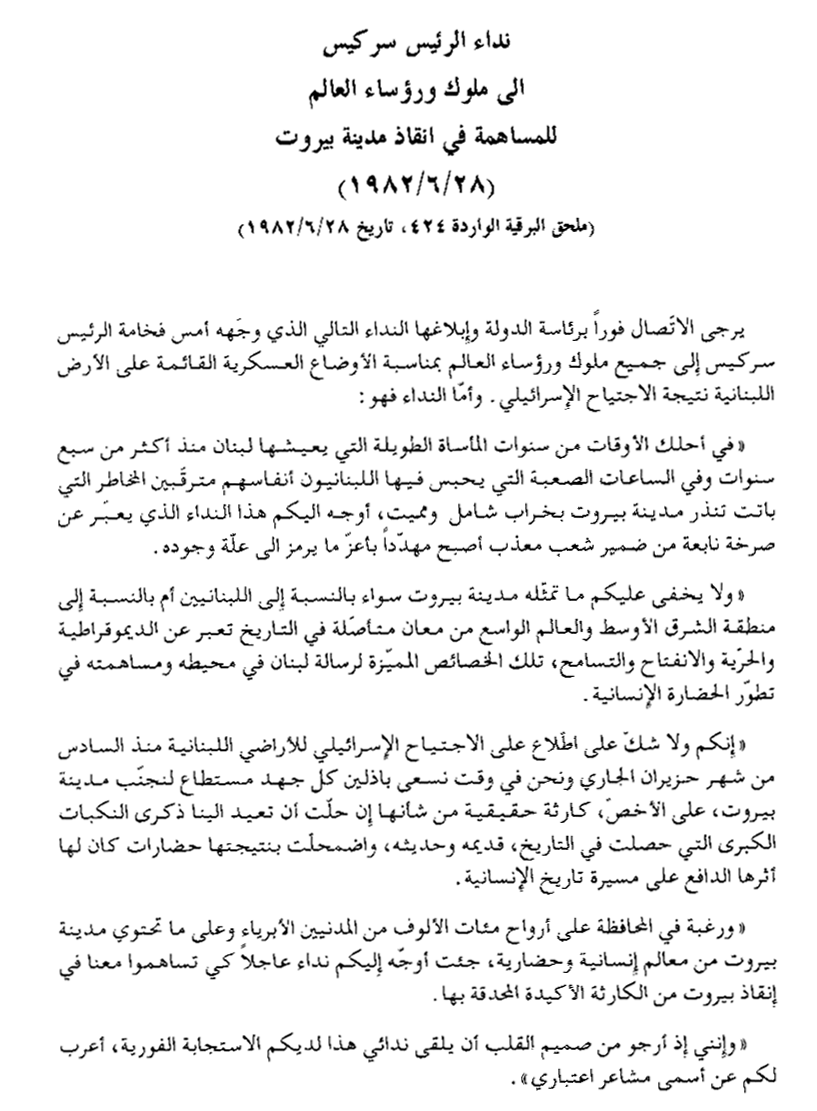 نداء الرئيس سركيس إلى ملوك ورؤساء العالم