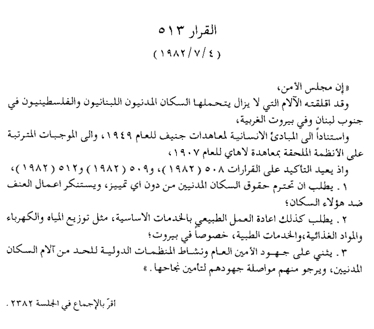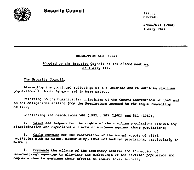 قرار مجلس الأمن الرقم (513)، الصادر في 4 يوليه 1982، بنصيه العربي والإنجليزي
