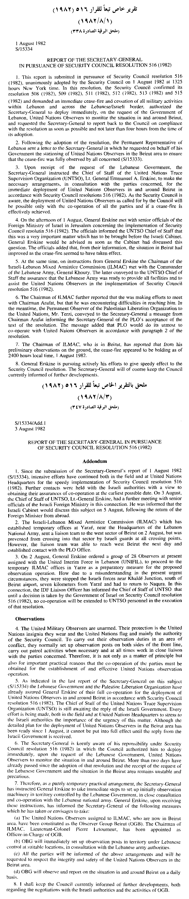 تقرير الأمين العام الخاص بالقرار الرقم (516)،
