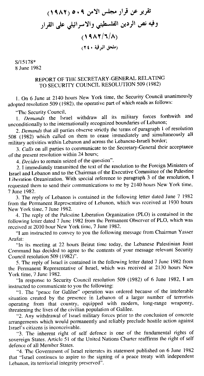 تقرير الأمين العام للمم المتحدة عن القرار الرقم (509)،