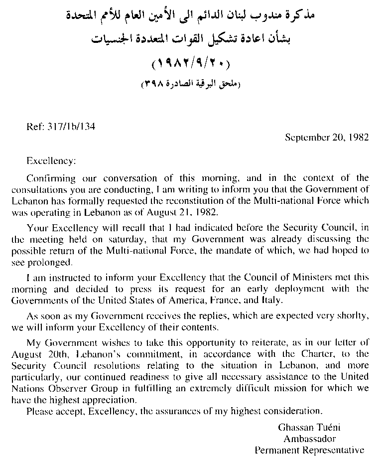 في شأن إعادة تشكيل القوات المتعددة الجنسيات، في 20 سبتمبر 1982