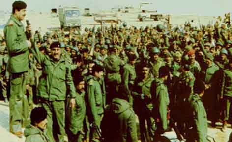 الرئيس العراقي صدام حسين يخطب في قواته في الكويت بعد غزوها في الثاني من أغسطس عام 1990.