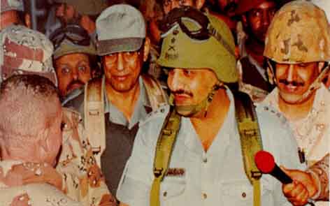 لحظة وصولنا إلى الكويت، بعد تحريرها مباشرة، ومعي اللواء صالح المحيّا، قائد المنطقة الشرقية (وهو الآن قائد القوات البرية) الذي يظهر في الصورة خلف كتفي اليمنى، كما يظهر إلى يساري الأمير العقيد تركي بن عبد الله، قائد كتيبة الشرطة العسكرية.