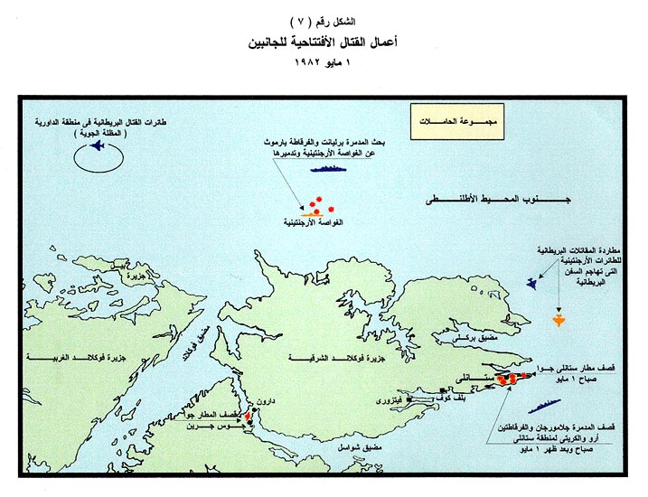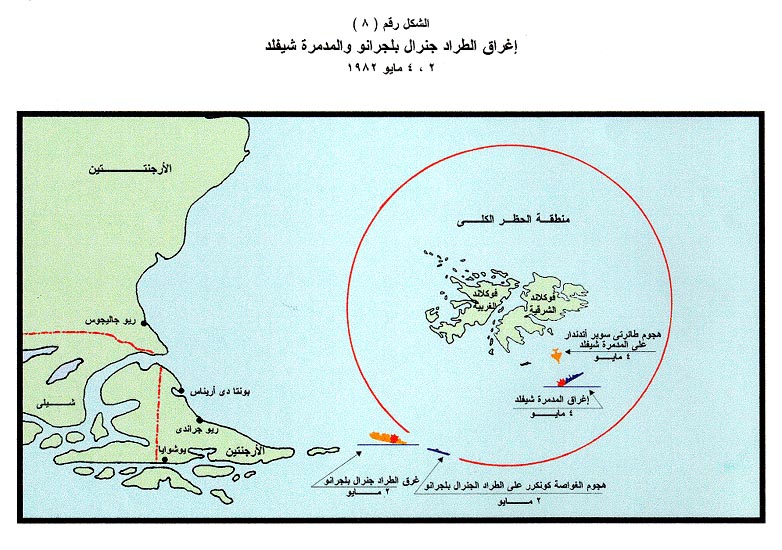 الفصل الثالث أولاً: أعمال قتال الجانبين خلال المرحلة الافتتاحية للحرب1. عام (الخريطة الرقم 1) على الرغم من أن مشكلة فوكلاند كانت تخص في ظاهرها مباشرة المصالح البريطانية والأرجنتينية فقط، إلاّ أنها جذبت اهتمام القوتين العظميين، فبدأت أقمار التجسس الأمريكية في تزويد القيادة البريطانية بما تحصل عليه من معلومات عن تحركات القوات الأرجنتينية أولاً بأول، بما في ذلك التعليمات التي تصدرها قيادة الأخيرة إلى وحداتها في عرض المحيط، وعلى الجانب الآخر قامت أقمار التجسس وطائرات الاستطلاع السوفيتية بعيدة المدى المتمركزة في "كوبا" و"أنجولا" بجمع المعلومات عن تحركات القوات البريطانية ومواقعها وإرسالها إلى القيادة الأرجنتينية بعد التقارب الفجائي بين البلدين في أعقاب صدور قرار مجلس الأمن الذي أدان الغزو الأرجنتيني للجزر. 2. أعمال القتال الافتتاحية للجانبين في منطقة "فوكلاند"، الأول من مايو، (الشكل الرقم 7) بدأ العدُّ التنازليّ لشن الحرب قبل أن يعلن "الكسندر هيج" رسمياً في الثلاثين من أبريل فشل وساطته لحل المشكلة سياسيا، فما أن تم إبلاغ الحكومة البريطانية برفض المجلس العسكري الحاكم في الأرجنتين لمقترحات "هيج" الأخيرة حتى أرسل الأدميرال "فيلد هاوس" إلى قائد قوة الواجب في جنوب الأطلنطي أمراً إنذارياً بالاستعداد للحرب اعتباراً من منتصف ليلة 29 أبريل، إلاّ أنه إزاء تأخر قوة الواجب في اتخاذ أوضاعها داخل منطقة العمليات بسبب سوء الأحوال الجوية أثناء الرحلة البحرية، وعدم إعلان "هيج" رسمياً عن فشل جهود وساطته إلاّ يوم 30 أبريل تأجل الموعد المحدد لبدء القتال. 3. إغراق الطراد "جنرال بلجرانو"، 2 مايو، (الشكل الرقم 8) على أثر نجاح الغزو الأرجنتيني لجزر "فوكلاند" وتعيين حاكم جديد لها، عاد الأسطول ـ الذي لعب الدور الرئيسي في تنفيذ وتأمين العملية- إلى قواعده في الأرجنتين، إلاّ أنه سرعان ما أبحر عائداً إلى منطقة الجزر لمواجهة قوة الواجب البريطانية التي كانت تقترب وقتئذ من تلك المنطقة، وكانت قيادة الأسطول الأرجنتيني المبحر معقودة لرير أدميرال "ألارا" على متن حاملة الطائرات "25 مايو"، والتي كانت تمثل التهديد الرئيسي الأول للسفن البريطانية المقتربة. وبينما اتجهت مجموعة الحاملة "25 مايو" إلى شمال الجزر، فإن الطرّاد "الجنرال بلجرانو" ومعه مدمرتا الحراسة اتجه إلى غربها للعمل كمجموعة حماية متقدمة من أي أعمال هجومية بريطانية ضد قاعدتي "ريو جراندي" الجوية و"يوشوايا البحرية"، وفي التاسع والعشرين من أبريل ـ قبل وصول قوة الواجب إلى منطقة الحظر ـ كانت وحدات الأسطول الأرجنتيني قد اتخذت أوضاعها شمال وغرب جزر "فوكلاند". وفي أول مايو رصدت إحدى طائرات الاستطلاع البحري الأرجنتينية مجموعة القتال الرئيسية لقوة الواجب على مسافة 300 ميل (482 كم) جنوب شرق مجموعة الحاملة "25 مايو"، فبدأت الأخيرة تحركها للاقتراب من السفن البريطانية، في الوقت الذي كان يجري فيه تسليح طائرات "سكاي هوك" على مَتْن تلك الحاملة لتوجيه ضربة جوية لمجموعة الحاملات البريطانية، التي كانت قيادتها تحاول جاهدةً معرفة مكان الحاملة الأرجنتينية، غير أن الغواصات البريطانية الثلاث في المنطقة لم ترصد تلك الحاملة أو تحركها في اتجاه مجموعة الحاملات البريطانية، على الرغم من أنَّ الغواصتين "سبلندد" و"سبارتان" كانتا تبحثان في طرق الاقتراب إلى السفن البريطانية من ناحية الشمال الغربي، بينما كانت "كونكرر" في طريقها إلى غرب جزر "فوكلاند" بعد أن تلقت الأمر يوم 28 أبريل بمغادرة مياه "جورجيا الجنوبية" إلى منطقة عملها الجديدة ـ خارج منطقة الحظر الكلي ـ بين جزر "فوكلاند" والسواحل الجنوبية للأرجنتين. وبعد منتصف ليلة 1/2 مايو، التقط أحد طياري المقاتلات "سي هارير" على شاشة رادار طائرته النبضات المرتدة من حاملة الطائرات الأرجنتينية ومدمرتي حراستها. وسرعان ما دُقعت داوريات مقاتلات "سي هارير"، إلى الاتجاه المهدد. وعلى الجانب الآخر، تأجلت الضربة الجوية الأرجنتينية، التي كان من 