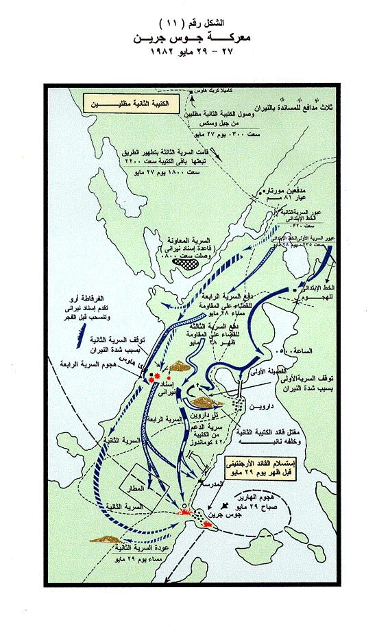 وعلى الرغم من أن تقارير المخابرات المشار إليها وتقارير استطلاع جماعات القوات الخاصة أعطت تصوراً كاملاً عن حجم وأوضاع القوات الأرجنتينية حول "ستانلي"، فإن معلوماتها عن القوات المنتظر مواجهتها في منطقة "جوس جرين" و"دارون" كانت أقل تحديداً، فَقَدْ قدَّرتها تلك التقارير ما بين سرية مدَّعمة ـ وهي قوة الحامية الأصلية في المنطقة ـ وكتيبة مشاة ناقصة، بالإضافة إلى أفراد القوات الجوية وبعض عناصر المدفعية والدفاع الجوي. وكان التقرير الثاني هو الأقرب إلى حقيقة تلك القوات عندما بدأ الهجوم عليها يوم 27 مايو، فمن إجمالي أعداد القوات الأرجنتينية في تلك المنطقة البالغ عددها ألفاً وخمسمائة فرد، كان هناك 554 فرداً من جنود المشاة (خليط من ثلاثة أفواج مختلفة)، والباقي من القوات الجوية والأسلحة المعاونة والوحدات الإدارية الأخرى.
