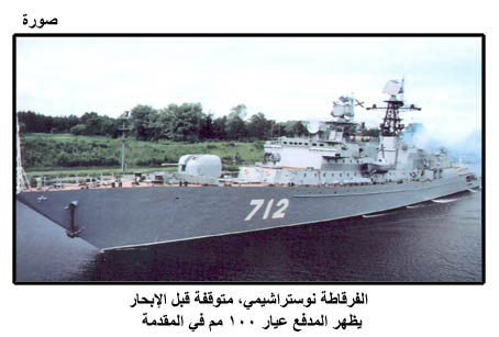 الفرقاطة نوستراشيمي، متوقفة قبل الإبحار، يظهر المدفع عيار 100 مم في المقدمة