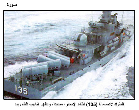 الطراد لاكسامانا (135) أثناء الإبحار، مبتعداً، وتظهر أنابيب الطوربيد