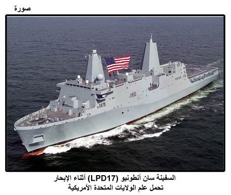 السفينة سان أنطونيو (LPD17) أثناء الإبحار، تحمل علم الولايات المتحدة الأمريكية