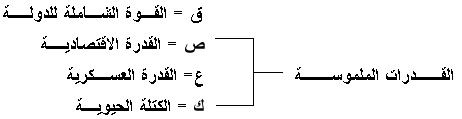القدرات المدركة للدولة = (الكتلة الحيوية + القدرة الاقتصادية + القدرة العسكرية + القدرة السياسية) × (الأهداف الاستراتيجية + الإرادة القومية +القدرة الدبلوماسية)