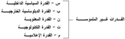 د. من المعادلة السابقة نجد أنه أضاف أبعاداً أخرى للعناصر غير الملموسة، وهي القدرة التكنولوجية، وقدرة الإعلام والمعلومات، كما اتفق معهما جزئياً في الأهداف الاستراتيجية والإرادة الوطنية في إطار القدرة السياسية (الداخلية)، والقدرة المعنوية، واتفق مع إضافة لواء/ احمد فخر لعنصر النفوذ، وإن كانت لم تؤخذ بشكل مستقل بل في إطار القدرة الدبلوماسية باعتبارها إطاراً أرحب وأشمل.