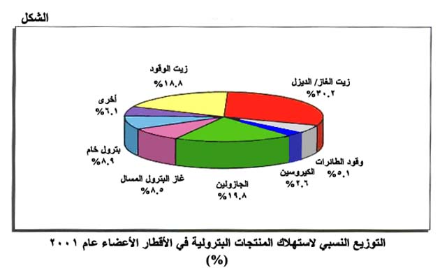 التوزيع النسبي لاستهلاك المنتجات البترولية في الأقطار الأعضاء عام 2001