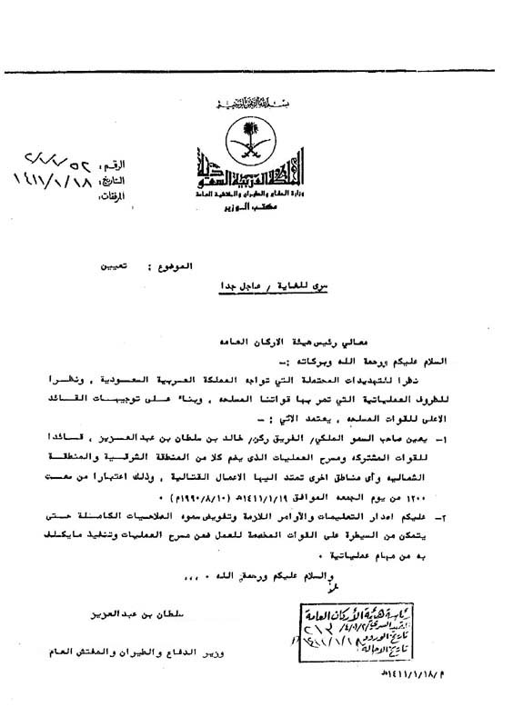 أمر تعيين صاحب السمو الملكي الفريق الركن خالد بن سلطان قائداً للقوات المشتركة ومسرح العمليات