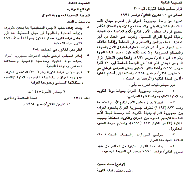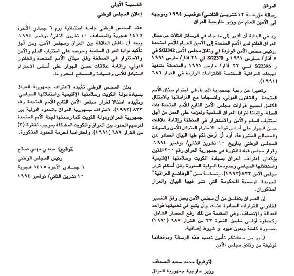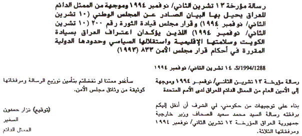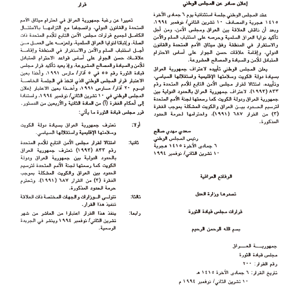 يحيل بها البيان الصادر عن المجلس الوطني العراقي وقرار مجلس قيادة الثورة يؤكدان اعتراف العراق بسيادة الكويت وسلامتها الإقليمية واستقلالها السياسي وحدودها الدولية المقررة في أحكام قرار مجلس الأمن 833 لسنة 1993