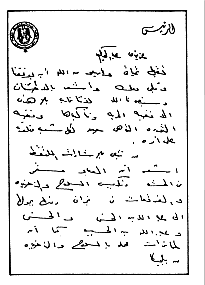 تقبل تحياتي. وأرجو من الله أن يوفقنا. وقلبي معك. وأشعر باطمئنان. وسينصرنا الله، لأننا نحارب بلا هدف، إلا قضية الحرية وتأكيدها، وقضية الثورة، التي هي حق لكل شعب مغلوب على أمره.