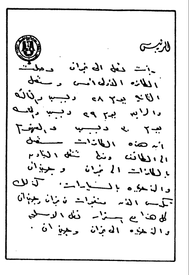 من تتبّعي للإشارات الملتقطة، أشعر أن العدو مستمر في الحشد وتكديس السلاح والذخيرة والمفرقعات في نجران. ومنها يحولها إلى عبدالله بن الحسن، والحسن. كما أن هناك طائرات محملة بالسلاح والذخيرة من بلجيكا، بدأت تصل إلى نجران. وصلت الطائرة الأولى أمس، وستصل الثانية يوم 28 ديسمبر، والثالثة والرابعة يوم 29 ديسمبر، والخامسة يوم 30 ديسمبر. والمفهوم أن هذه الطائرات، ستصل إلى الطائف، ومنها تنقل البنادق، بالطائرات، إلى نجران وجيزان، والذخيرة بالسيارات. كذلك، تكدس، الآن، متفجرات في نجران وجيزان. كل هذا مع استمرار نقل الأسلحة والذخيرة إلى نجران وجيزان. وأنا، الآن، أشد اقتناعاً، أن علينا أن نهاجم نجران وجيزان، وننقل معركتنا من الدفاع إلى الهجوم. وفي رأيي، أن الوساطة الأمريكية، كانت خدعة، الغرض منها تخفيف حماسنا واندفاعنا، ومنْعنا من القيام بأي عمل ضد قواعد الحشد في السعودية".