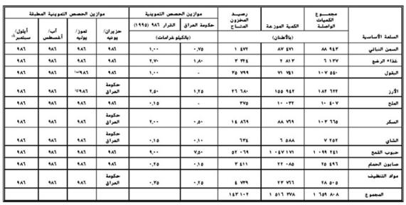 كميات السلع الغذائية التي وصلت إلى العراق ومقدار توزيعها وأرصدة المخزون