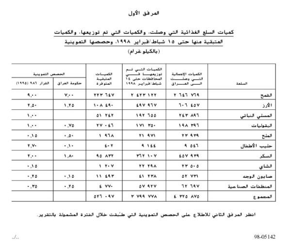 كميات السلع الغذائية التي وصلت، والكميات التي تم توزيعها، والكميات المتبقية منها حتى 15 شباط/ فبراير 1998، وحصصها التموينية