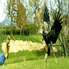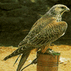 صقر يقف على يد صقَّار، وعيناه مغطيتان بالبرقع