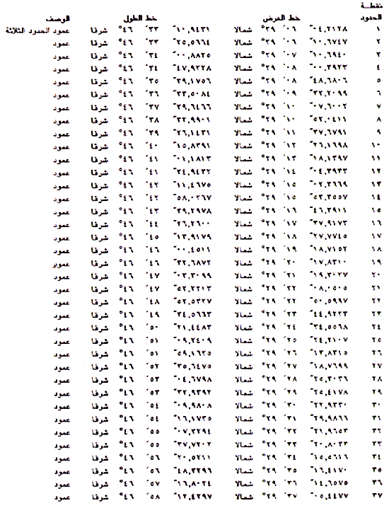 119 -   الحدود في وادي الباطن، من العمود رقم 1 حتى العمود رقم 72 هي عبارة عن سلسلة خطوط مستقيمة بين أعمدة الحدود تتطابق مع محور الوادي. والعمود رقم 1 على الحدود بين العراق والكويت هو العمود رقم 1 القائم حاليا على الحدود بين العراق والمملكة العربية السعودية. والعمود رقم 72 يقع على تقاطع محور وادي الباطن مع خط العرض لنقطة جنوب صفوان.