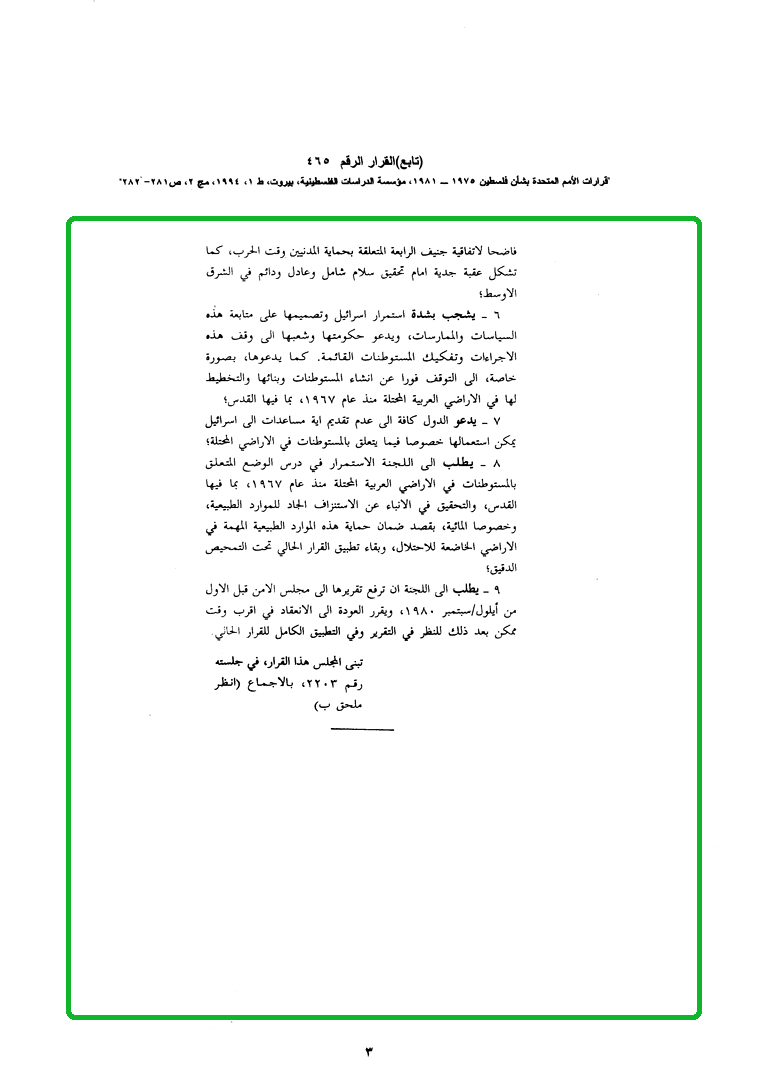 (تابع) مطالبة إسرائيل بتفكيك المستوطنات القائمة والتوقف عن التخطيط للمستوطنات وبنائها في الأراضي العربية المحتلة بما فيها القدس