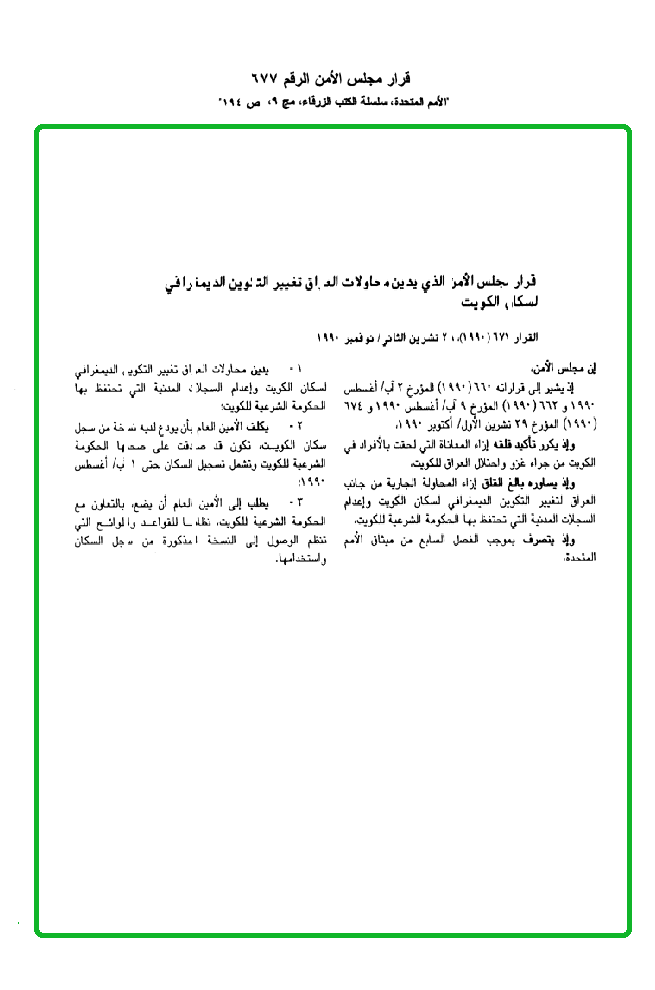 يدين محاولات العراق تغيير التكوين الديموجرافي لسكان الكويت